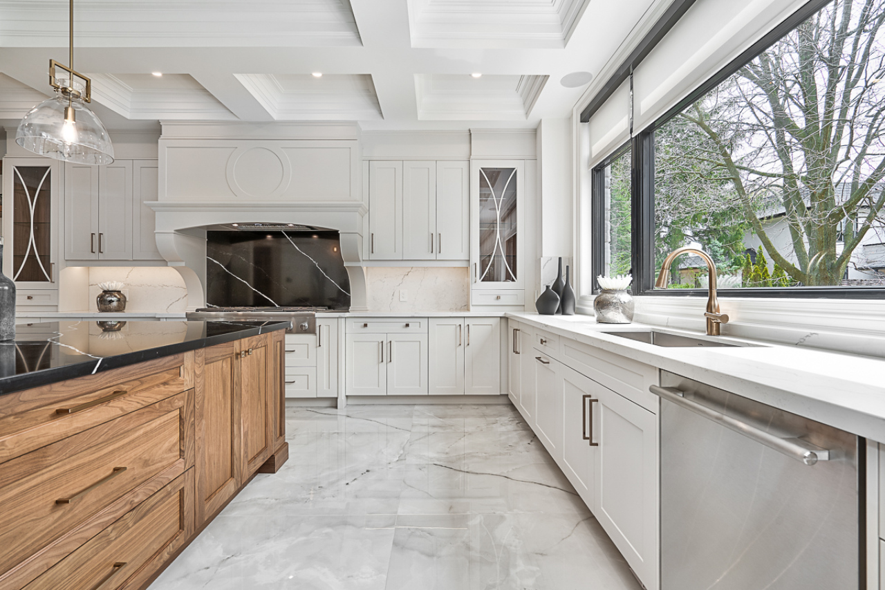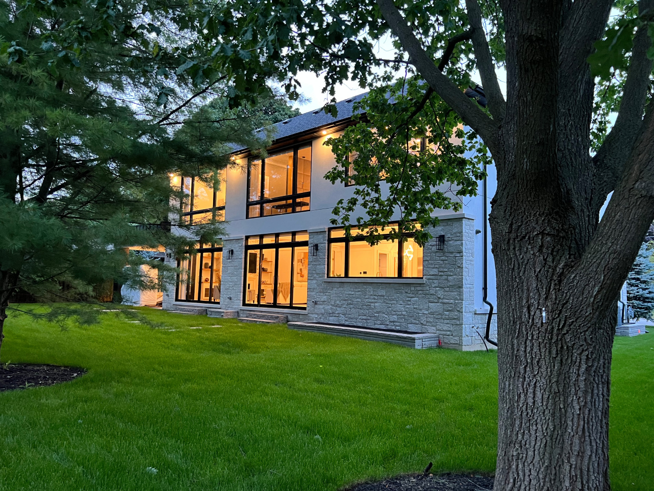 Set within a richly treed residential landscape, this custom home is conceived as a contemporary residence with a quiet, timeless posture—crisp massing, refined proportions, and a material palette that feels both modern and enduring. White masonry and smooth cladding are grounded by a base of light-toned stone, while deep charcoal window frames and a tailored roofscape add precision and contrast. The composition balances clean geometry with warm restraint: generous glazing, disciplined lines, and a calibrated rhythm of solid and void create a façade that reads as elegant rather than overtly expressive.