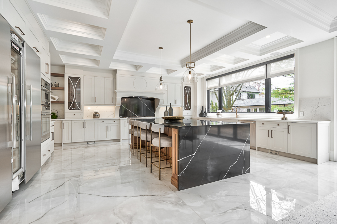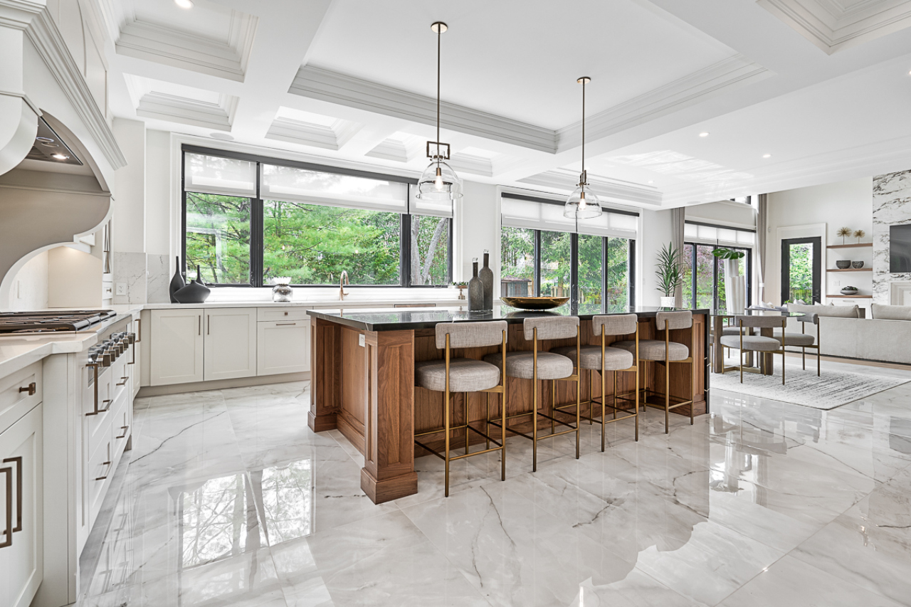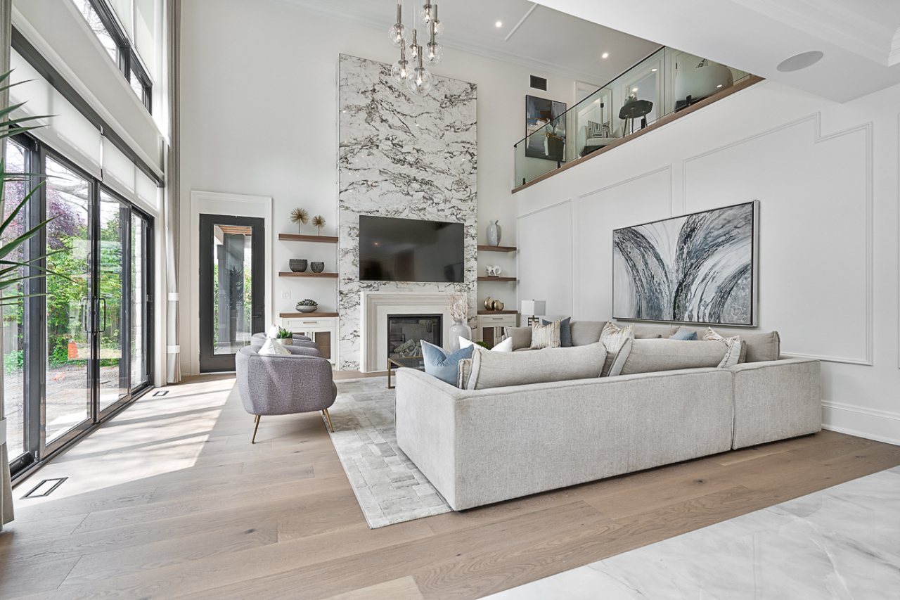 Inside, the home is organized around luminous, volume-rich living spaces that emphasize calm continuity. A double-height great room draws daylight deep into the plan, anchored by a dramatic full-height stone fireplace feature wall and flanked by finely detailed millwork. Large-format glazing dissolves boundaries to the garden, transforming the changing seasons into an interior backdrop. The result is a residence defined by clarity and composure—where architecture and landscape are inseparable, and every space feels connected to light, air, and the surrounding trees.