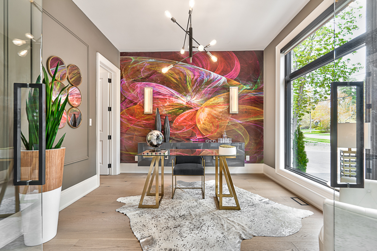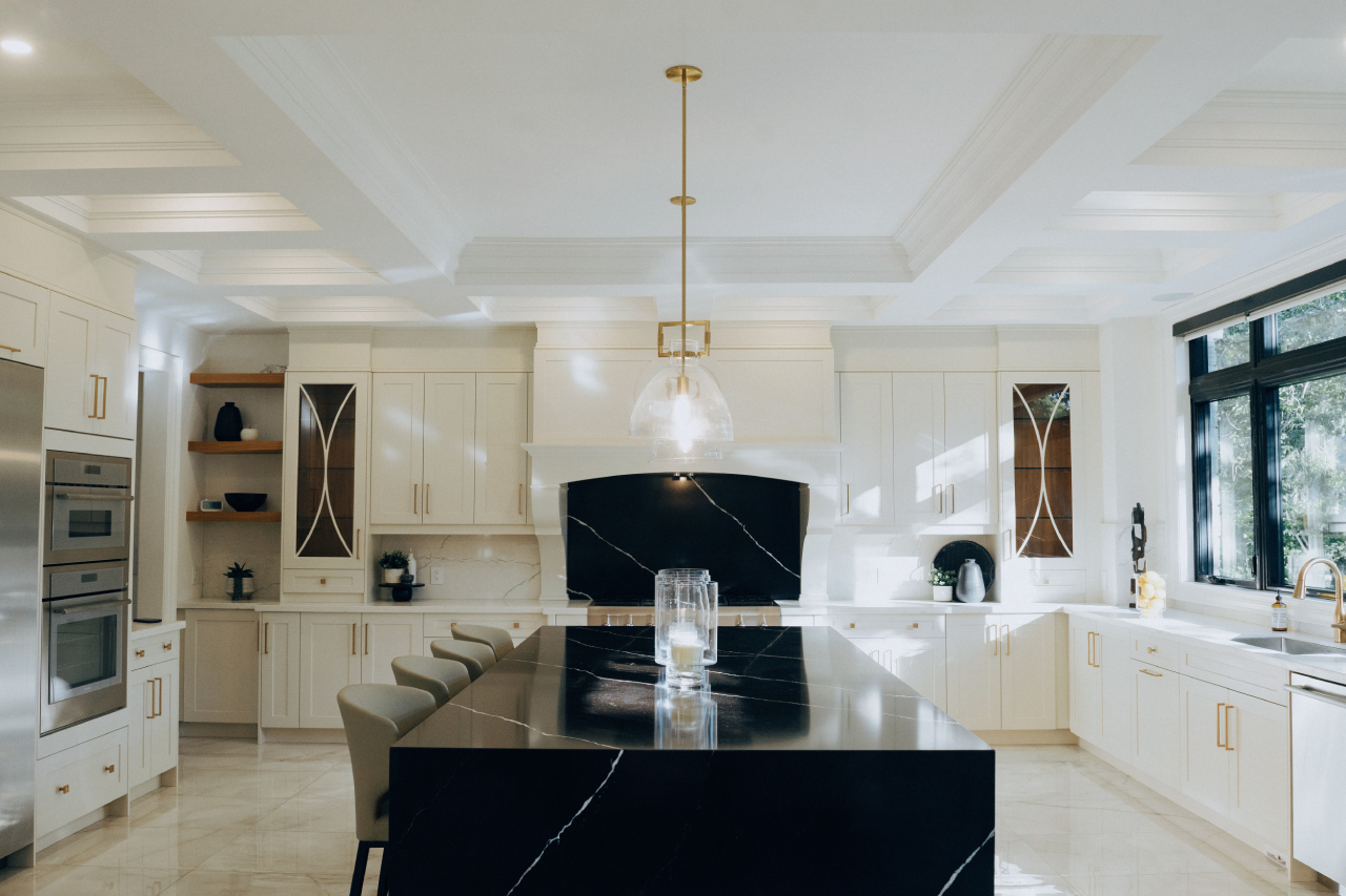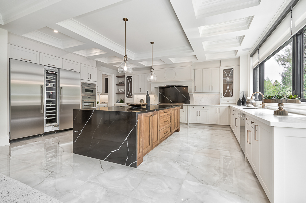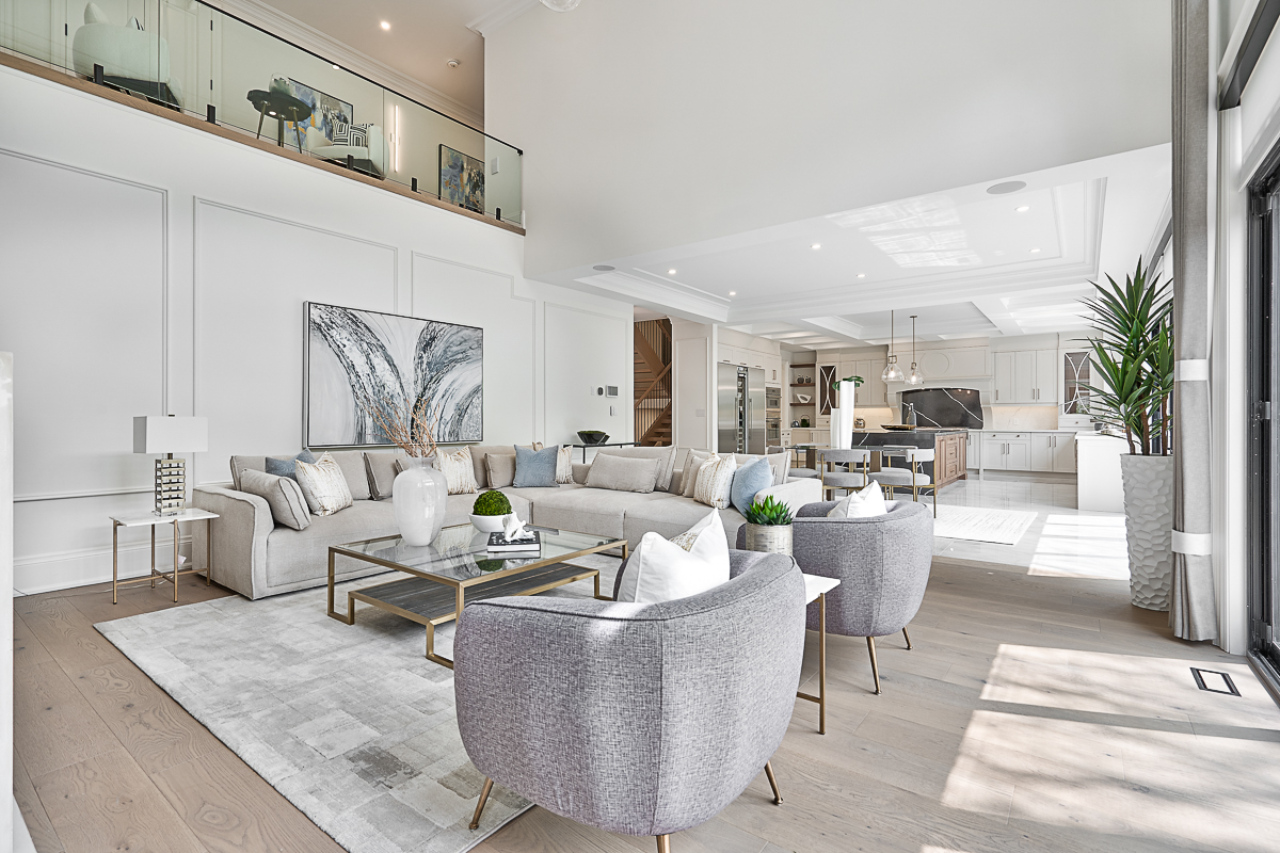 Inside, the home is organized around luminous, volume-rich living spaces that emphasize calm continuity. A double-height great room draws daylight deep into the plan, anchored by a dramatic full-height stone fireplace feature wall and flanked by finely detailed millwork. Large-format glazing dissolves boundaries to the garden, transforming the changing seasons into an interior backdrop. The result is a residence defined by clarity and composure—where architecture and landscape are inseparable, and every space feels connected to light, air, and the surrounding trees.