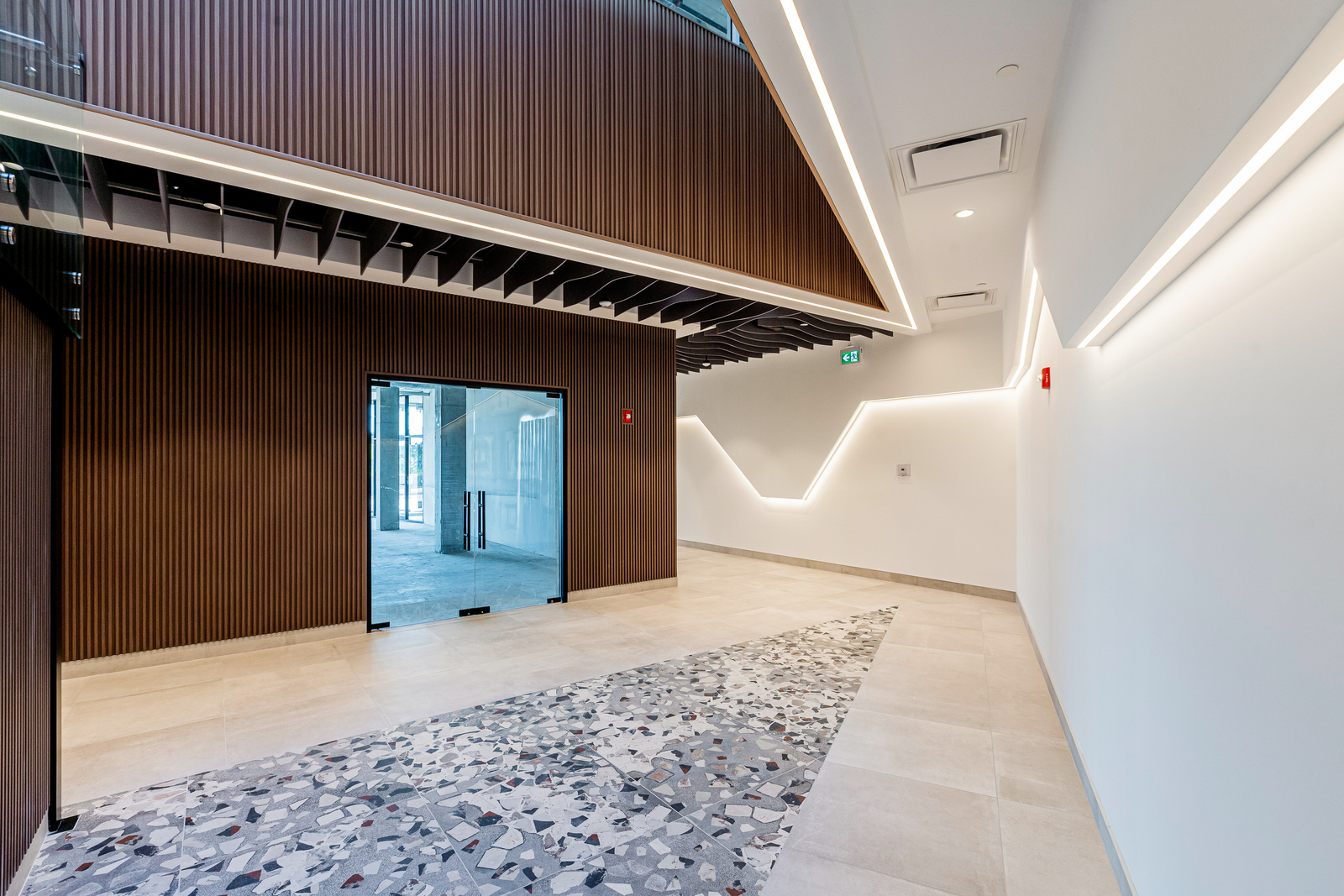 To create a sense of warmth and sophistication, we paired clean white wall planes with warm vertical wood slats. A terrazzo-patterned floor inlay traces the main circulation path, bringing texture and visual interest underfoot.