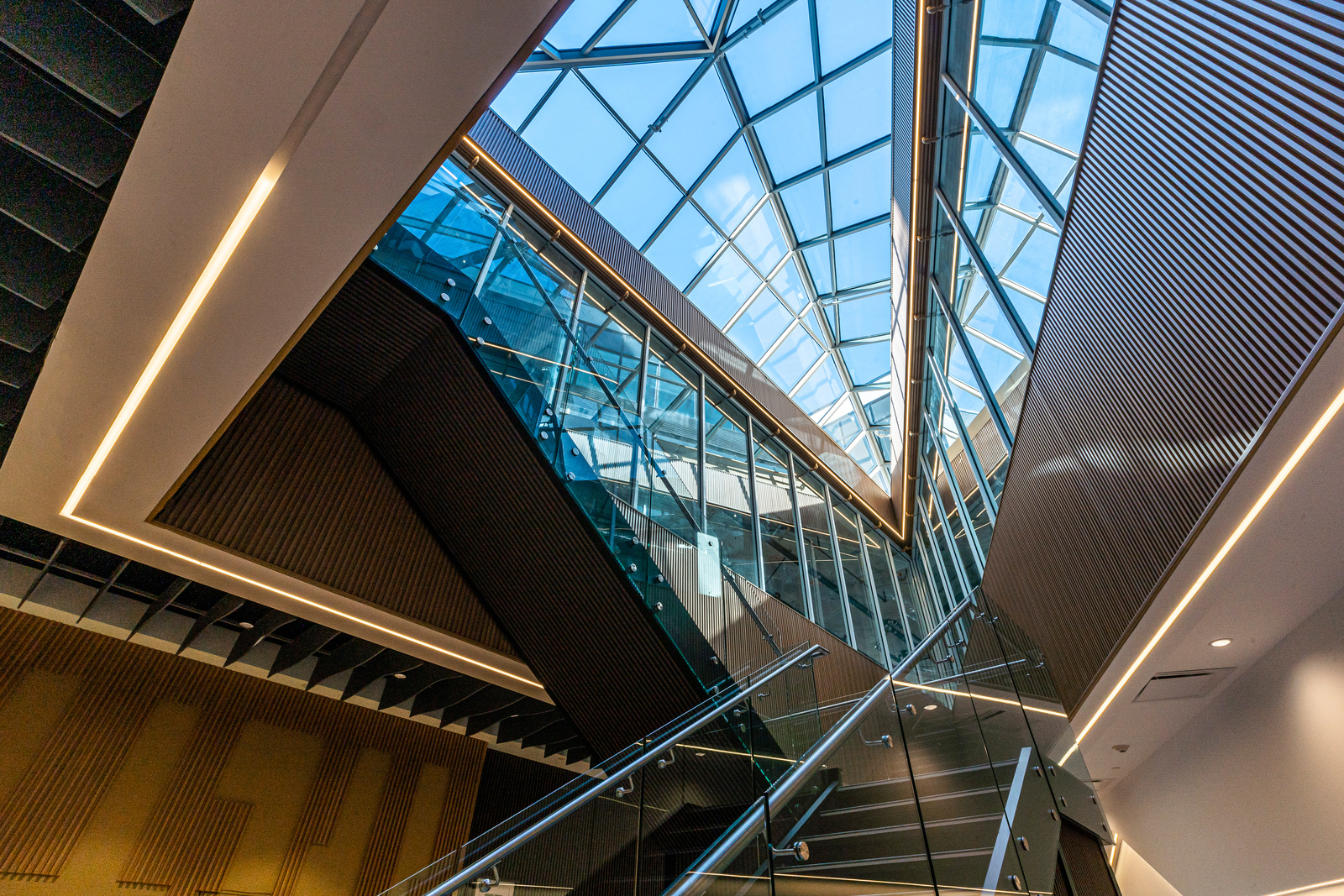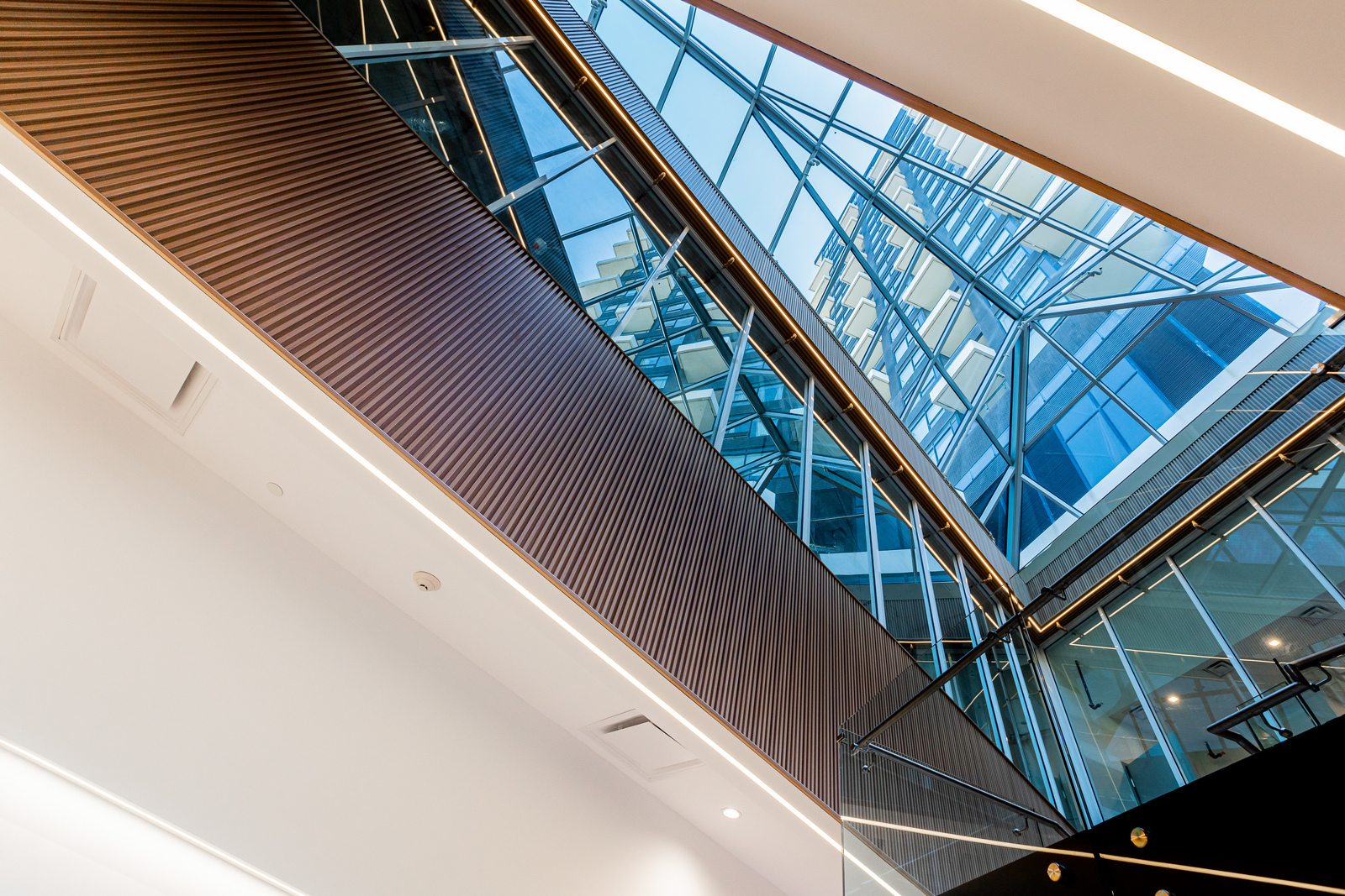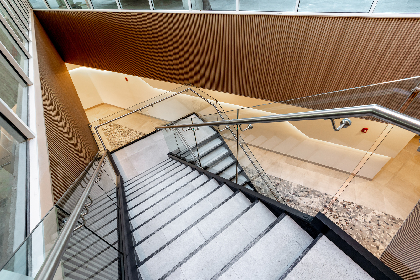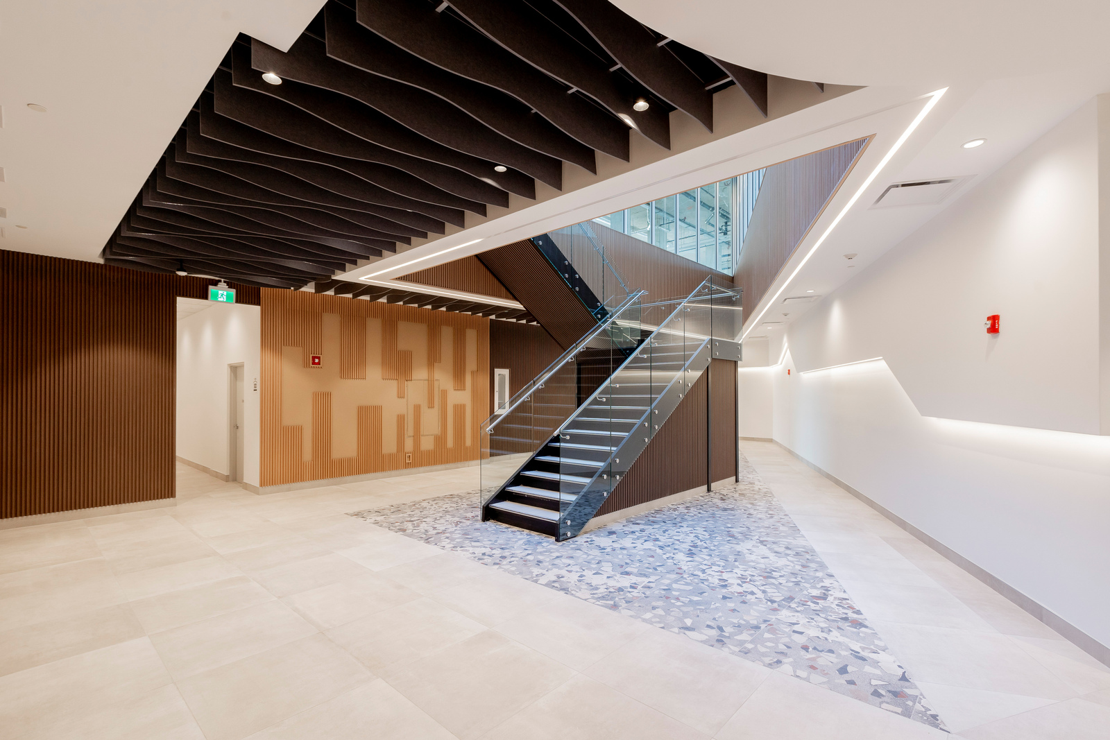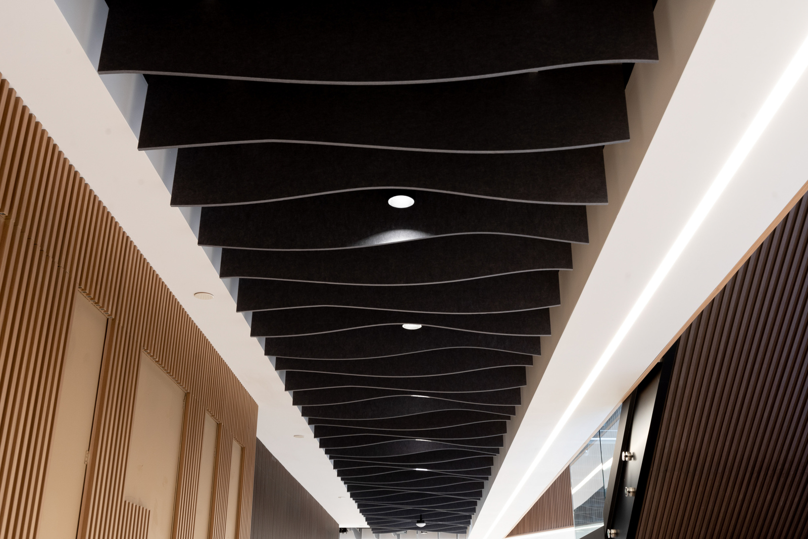 Above, wave-form acoustic baffles add depth and movement to the ceiling while improving sound quality. These carefully selected materials and details elevate the everyday experience of moving through the building.