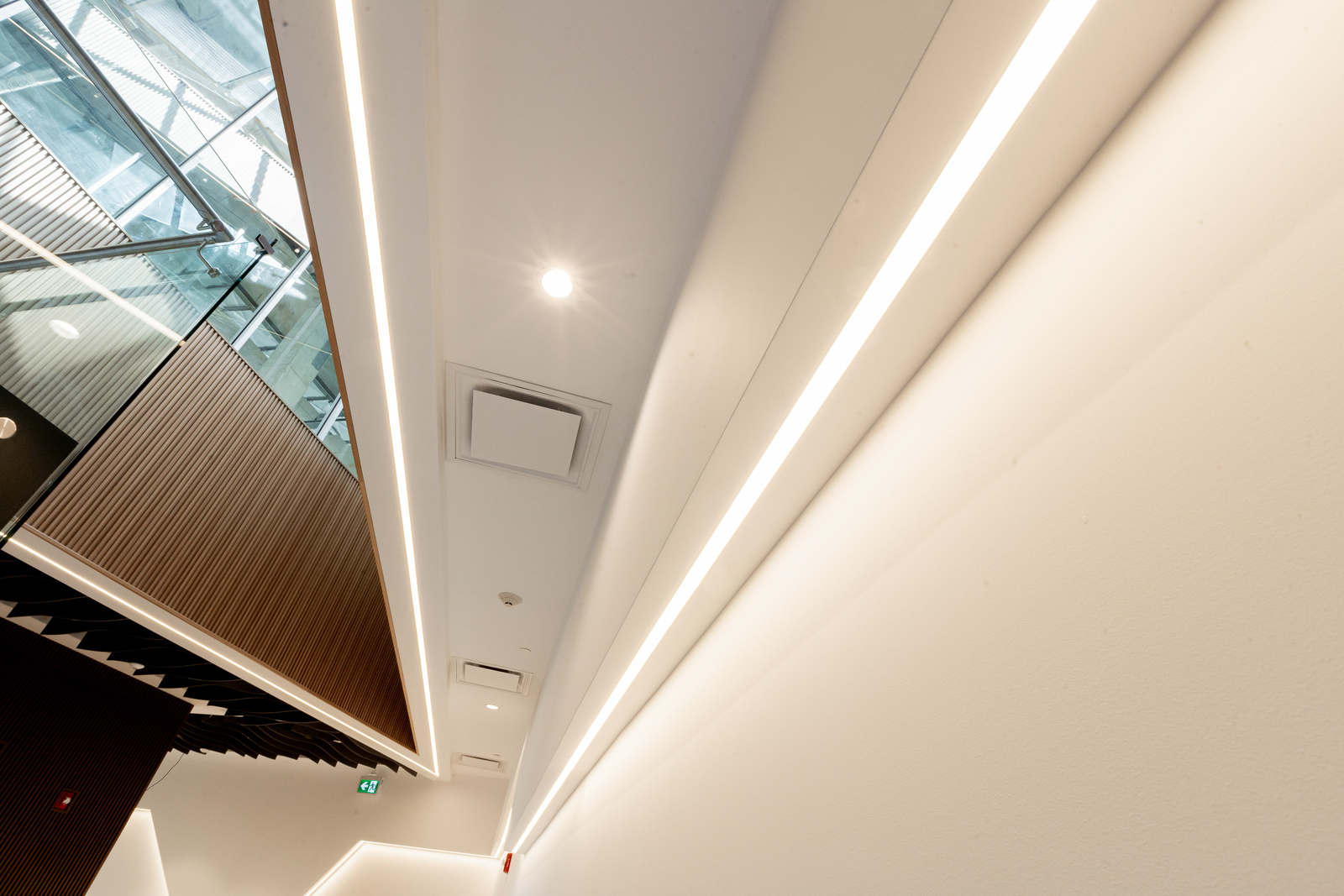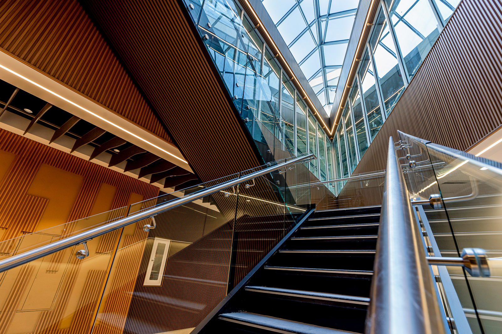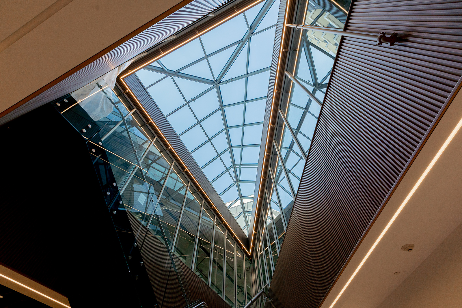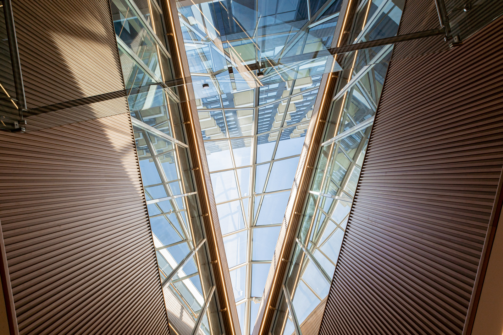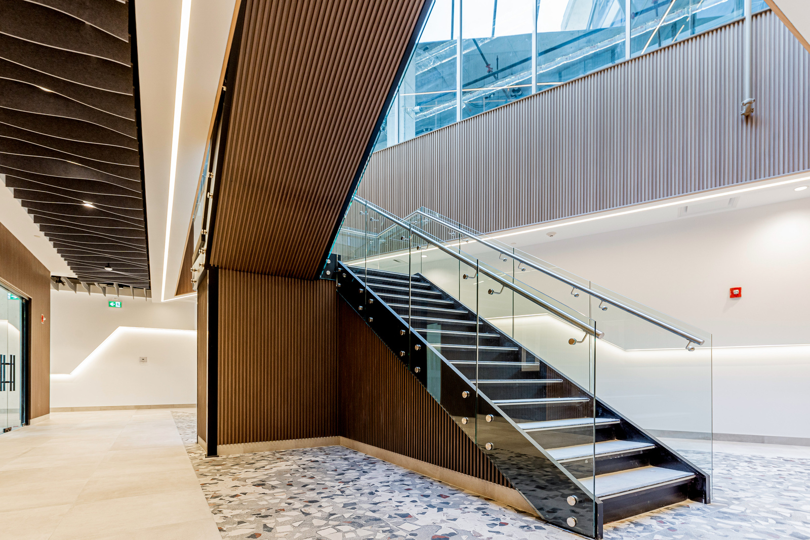Above, wave-form acoustic baffles add depth and movement to the ceiling while improving sound quality. These carefully selected materials and details elevate the everyday experience of moving through the building.