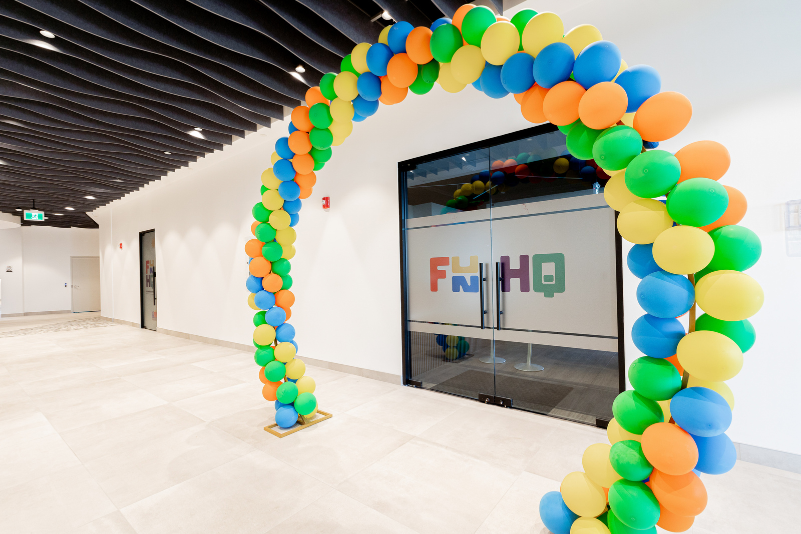 From the moment you enter, the space feels open, vibrant, and inviting. A continuous line of integrated LED lighting sweeps across angled walls and ceiling planes, naturally guiding movement through the lobby and corridors. This feature doesn’t just illuminate the space—it adds a sense of energy and direction, turning a transitional area into a visually striking experience.